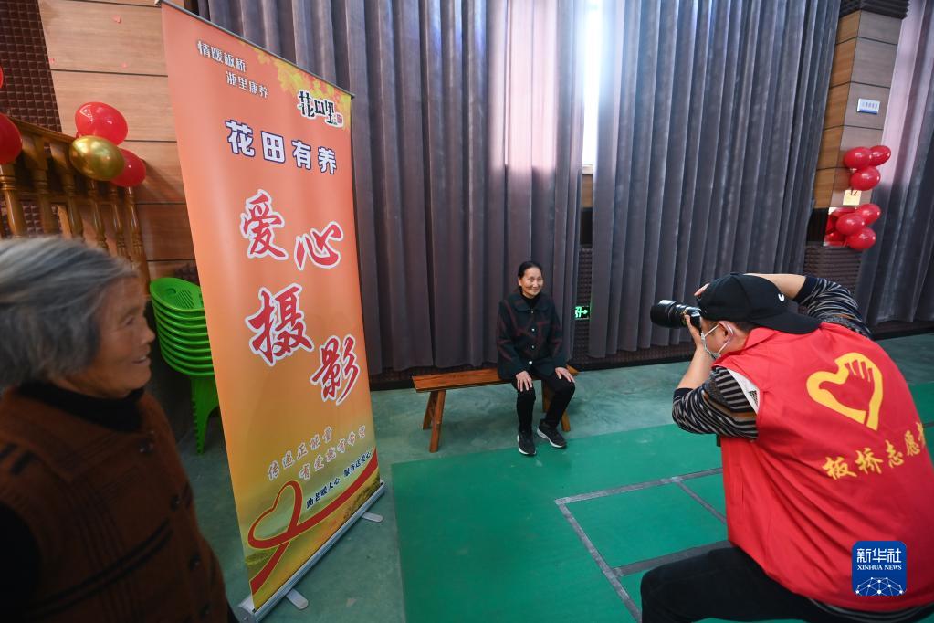 11月22日,在杭州市臨安區板橋鎮花戲村文化禮堂,攝影師給過(guò)集體生日的老人拍照片。