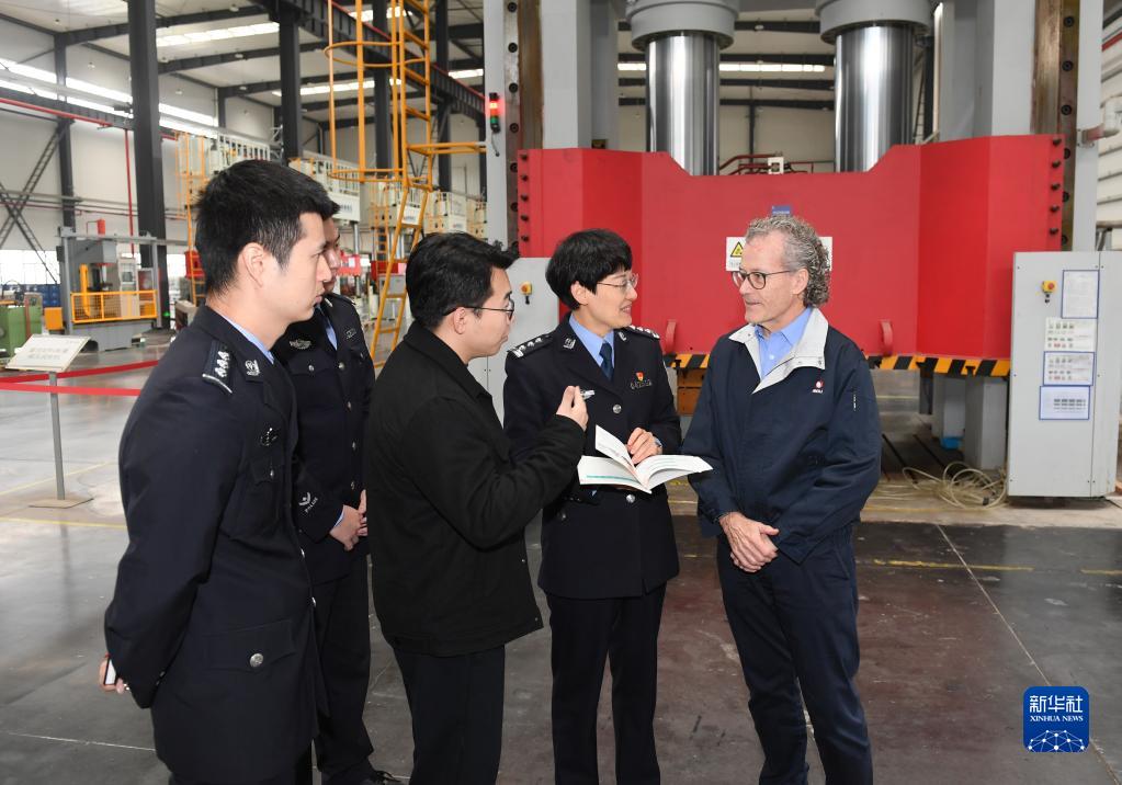 11月22日,在新昌縣浙江美力科技股份有限公司,當地出入境管理大隊工作人員為一名瑞士籍專(zhuān)家(右一)介紹居留政策。