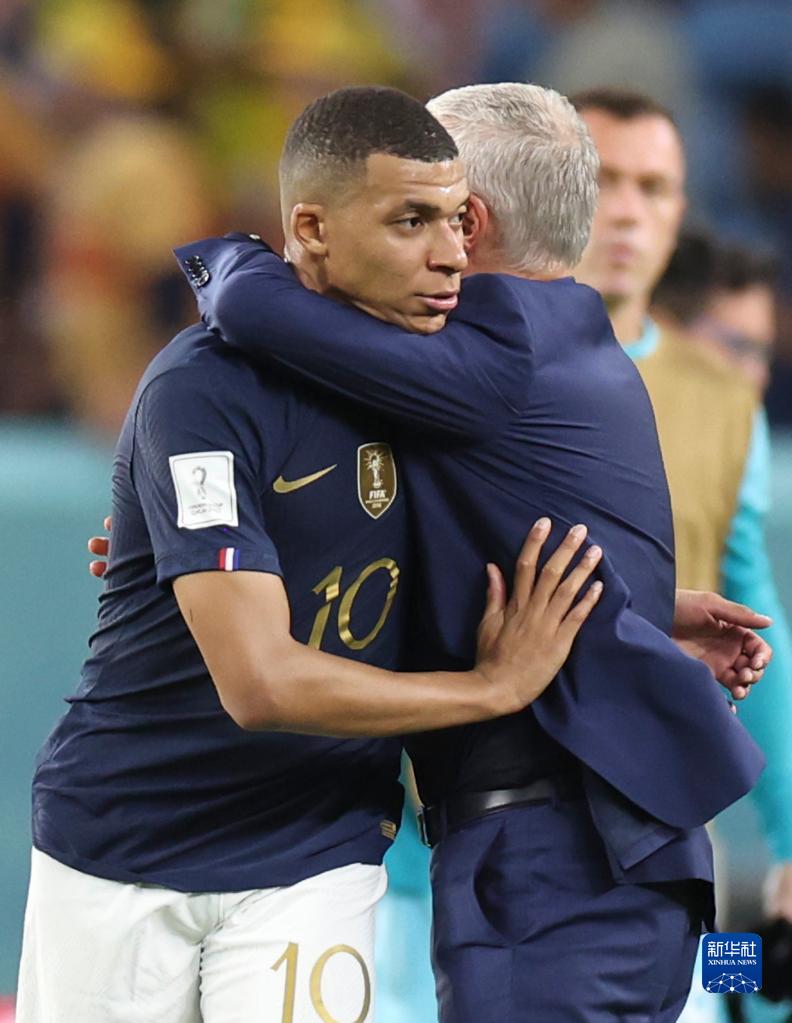 11月22日,法國隊球員姆巴佩(左)與主教練德尚在比賽后慶祝。