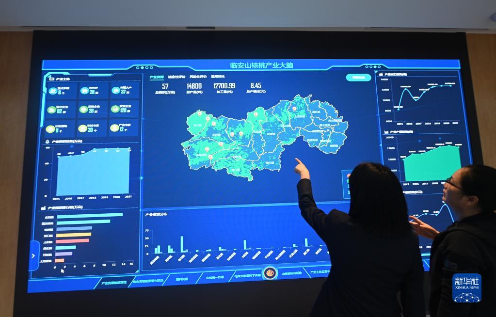 這是11月22日在位于杭州市臨安區龍崗鎮的中國堅果炒貨食品城拍攝的臨安山核桃產(chǎn)業(yè)大腦數字化系統,數據涵蓋了臨安當地262家合作社、160家加工廠(chǎng)的山核桃種植、加工、銷(xiāo)售信息。