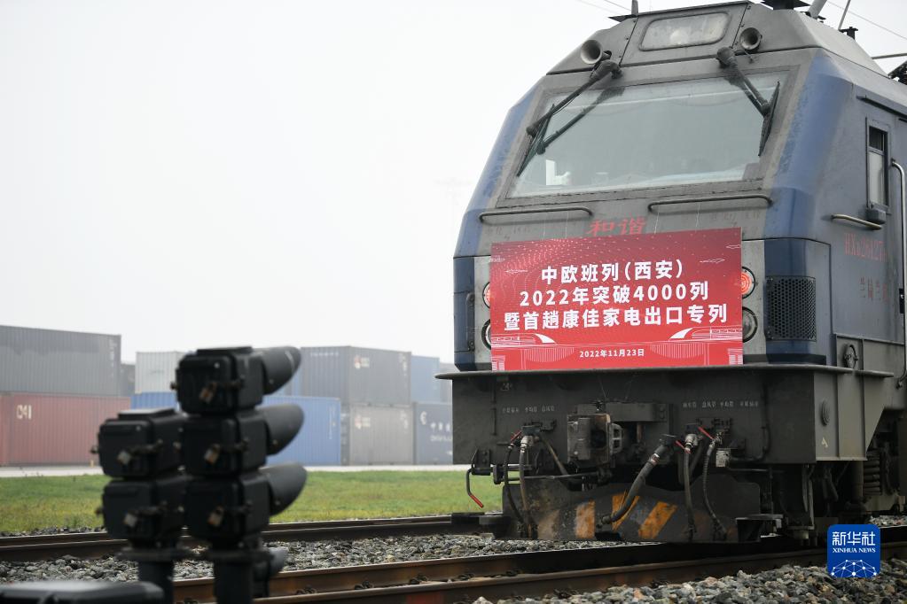 11月23日,滿(mǎn)載家電產(chǎn)品的中歐班列在西安國際港站等待發(fā)車(chē)。
