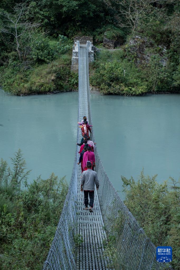 11月8日,在尼泊爾勒姆宗縣,村民走過(guò)水電站項目公司幫助修繕的吊橋。