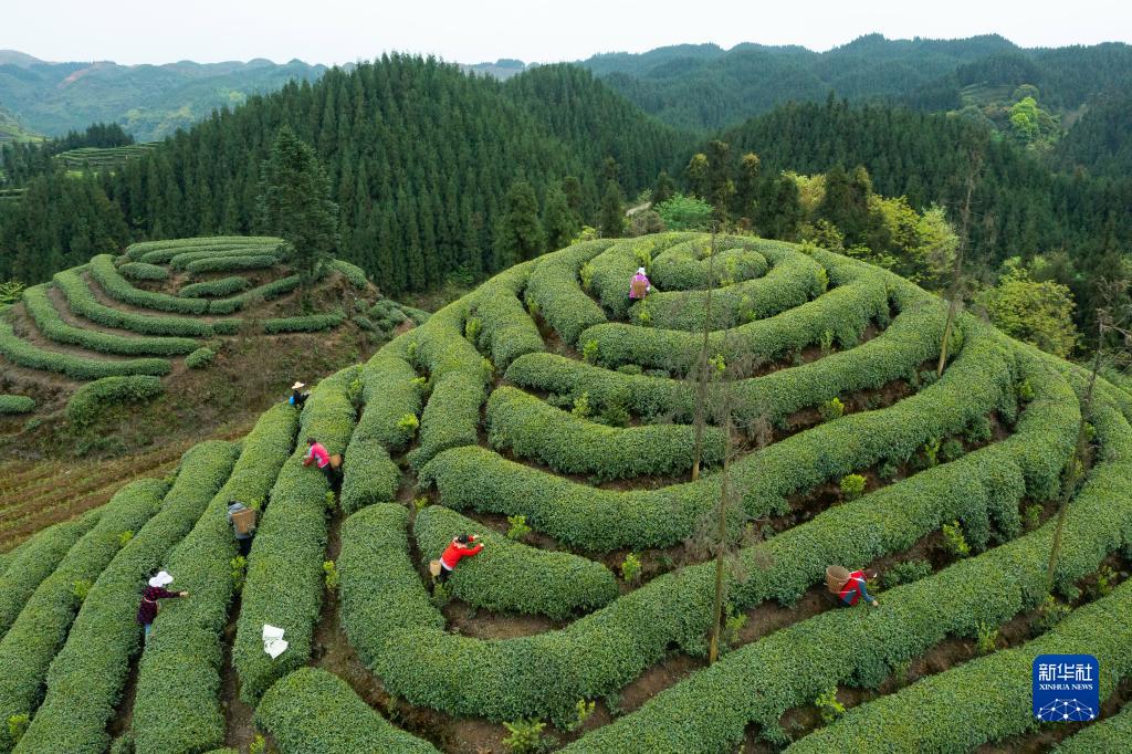 在四川省雅安市名山區的茶園,與張躍華合作的茶農在采摘鮮葉(2022年3月30日攝,無(wú)人機照片)。蒙山茶產(chǎn)于四川省雅安市名山區境內的蒙頂山,是綠茶的一種。張躍華,生于1959年,是國家級非物質(zhì)文化遺產(chǎn)代表性項目——綠茶制作技藝(蒙山茶傳統制作技藝)的代表性傳承人。張躍華自幼隨父親學(xué)習蒙山茶傳統制作技藝,是“張氏甘露”第五代傳人,他每年都要招收年輕徒弟,希望蒙山茶傳統制作技藝能世世代代傳承下去。
