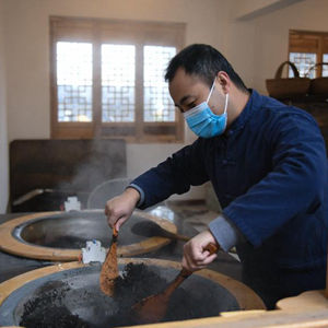 在咸陽(yáng)“益生源記”仿古茯茶作坊,筑茶師王萌樂(lè )展示炒茶工藝(11月30日攝)。