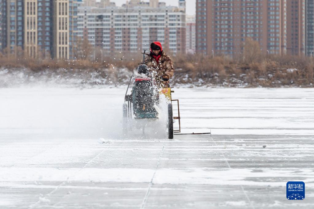 目前,“冰城”哈爾濱市已進(jìn)入“采冰季”。工人從封凍的松花江采冰,并將冰塊運往哈爾濱市的重要景點(diǎn)等地,用于冰雪景觀(guān)的搭建制作。