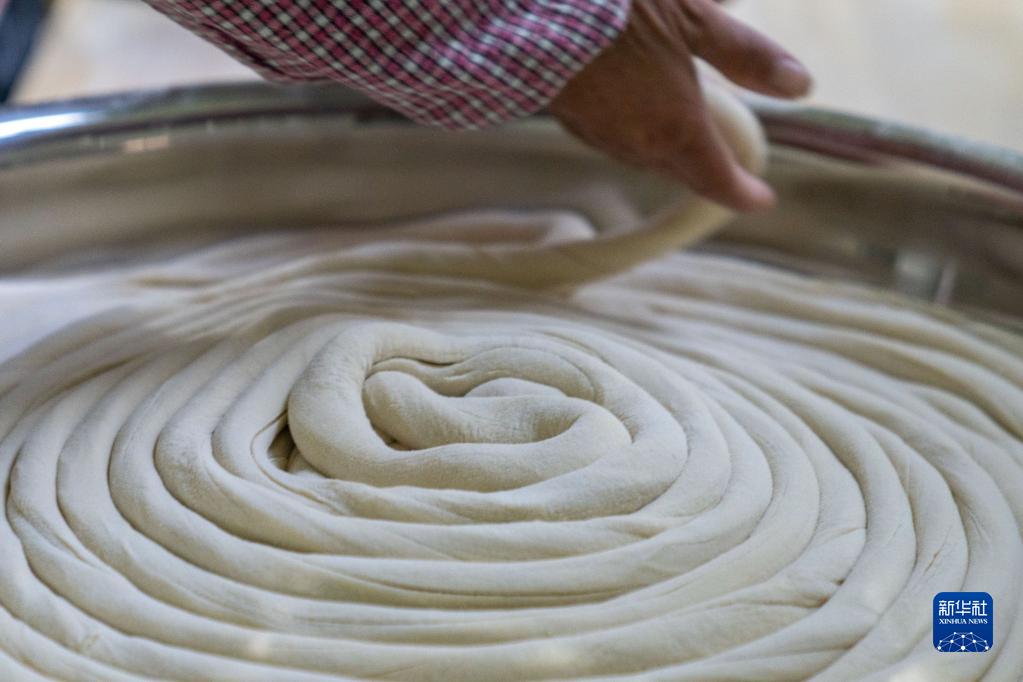 12月12日,在竹塘社區掛面合作社的掛面車(chē)間,工人將搓好的面放入醒面盆。