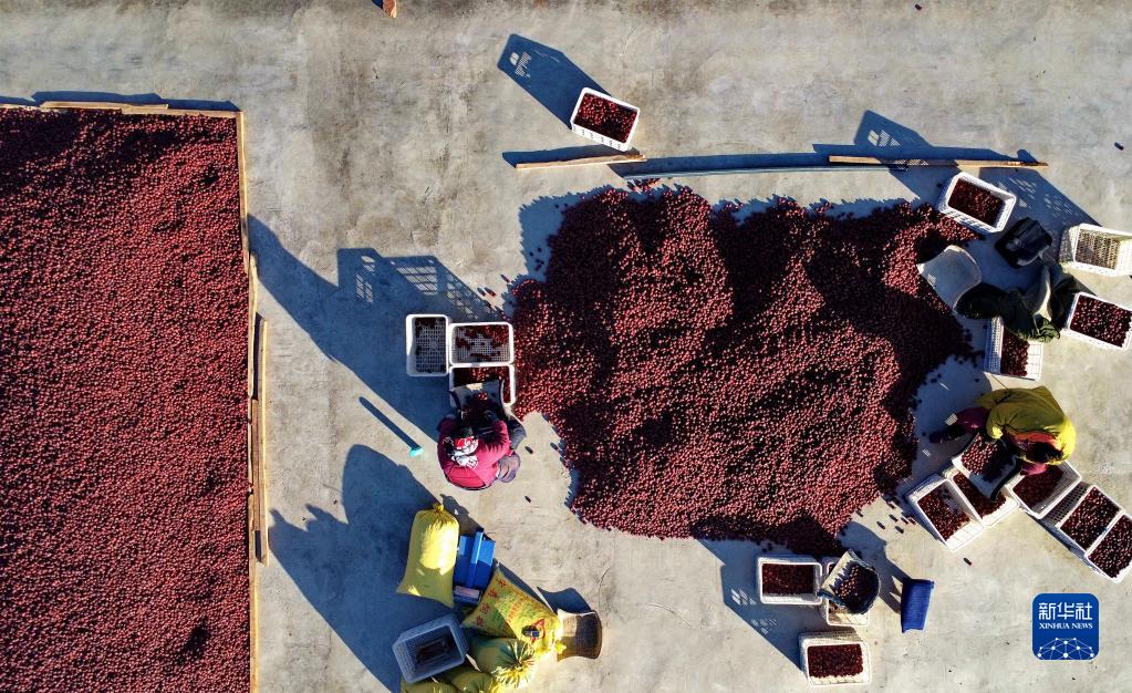 連日來(lái),河北省石家莊市行唐縣大棗種植戶(hù)利用晴好天氣對大棗進(jìn)行晾曬、篩選,供應市場(chǎng)。近年來(lái),行唐縣政府引導當地群眾利用丘陵和淺山區地帶種植優(yōu)質(zhì)大棗樹(shù),促進(jìn)農民增收。