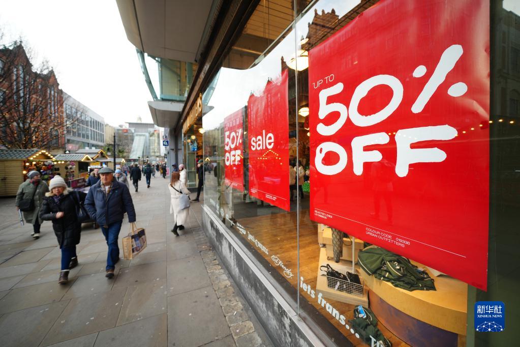 12月13日,人們走過(guò)英國曼徹斯特街上的促銷(xiāo)廣告。