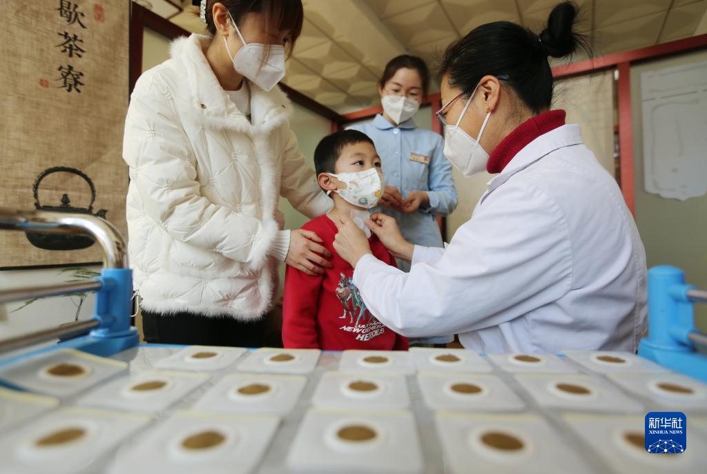 12月19日,山東省臨沂市沂南縣中醫醫院,醫生為一名兒童進(jìn)行穴位貼敷療法。新華社發(fā)(王彥冰 攝)