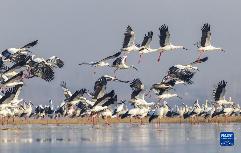 近日,數百只東方白鸛飛臨山東省臨沂市郯城縣沂河畔越冬,給平靜的河灘增添了一道靚麗的風(fēng)景。