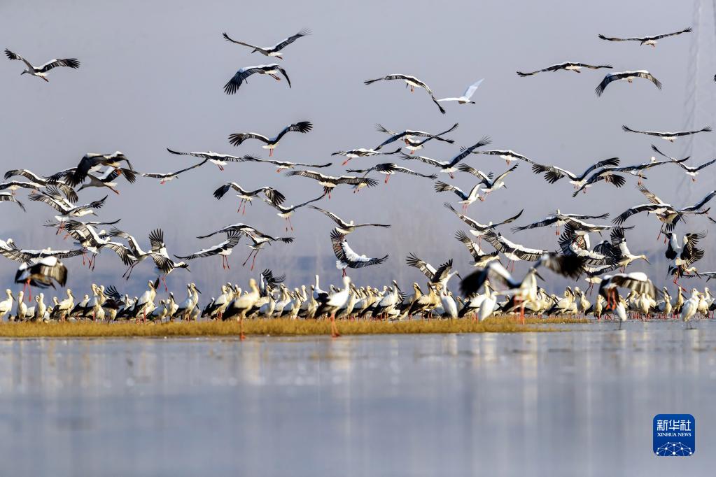 近日,數百只東方白鸛飛臨山東省臨沂市郯城縣沂河畔越冬,給平靜的河灘增添了一道靚麗的風(fēng)景。