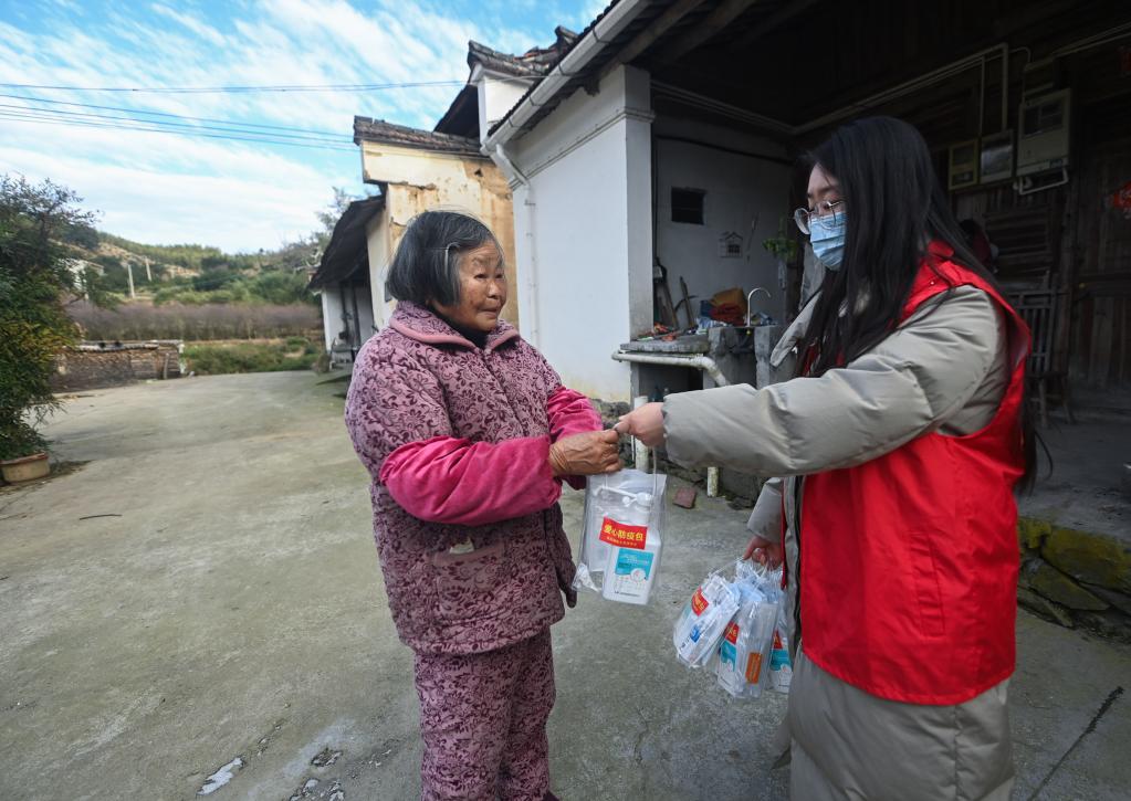 為了保證這些老年人的身體健康,東白湖鎮各村都組建了由村里的黨員、干部、鄉賢等組成的愛(ài)心志愿團隊,籌集退燒藥、抗原檢測試劑、消毒液、口罩等防疫物資,分送給行動(dòng)不便及年老體弱的老人們。同時(shí),鎮衛生院的家庭醫生還為老人及留守兒童提供免費上門(mén)看診、健康監測等服務(wù)。