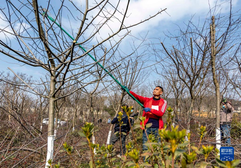 12月21日,村民在貴州省黔西市蓮城街道老鴰河社區花卉苗木基地剪枝。