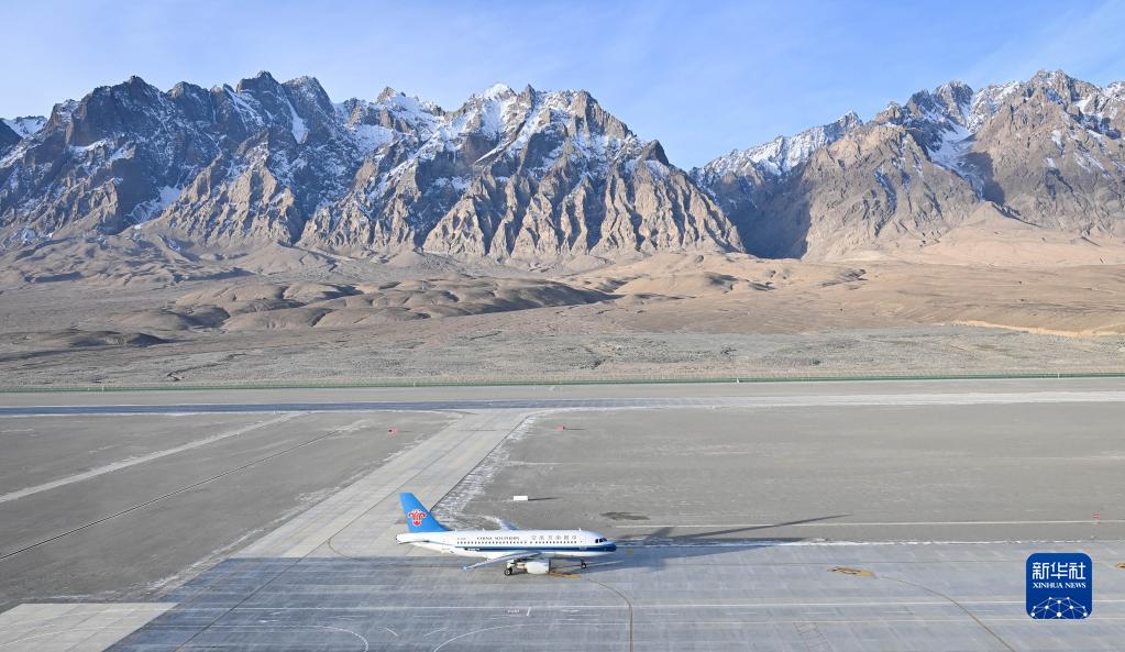 12月23日,在塔什庫爾干紅其拉甫機場(chǎng)的跑道上,首航航班在滑行。