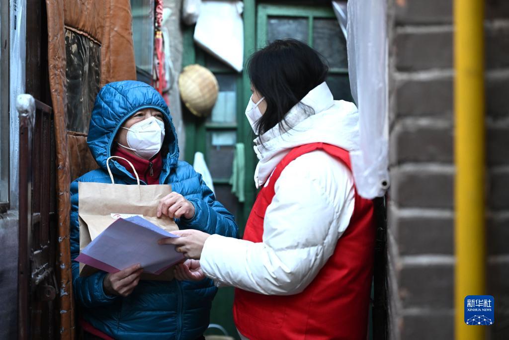 12月23日,在天津市和平區福明社區,社區工作者上門(mén)為困難人員發(fā)放“健康防疫包”。