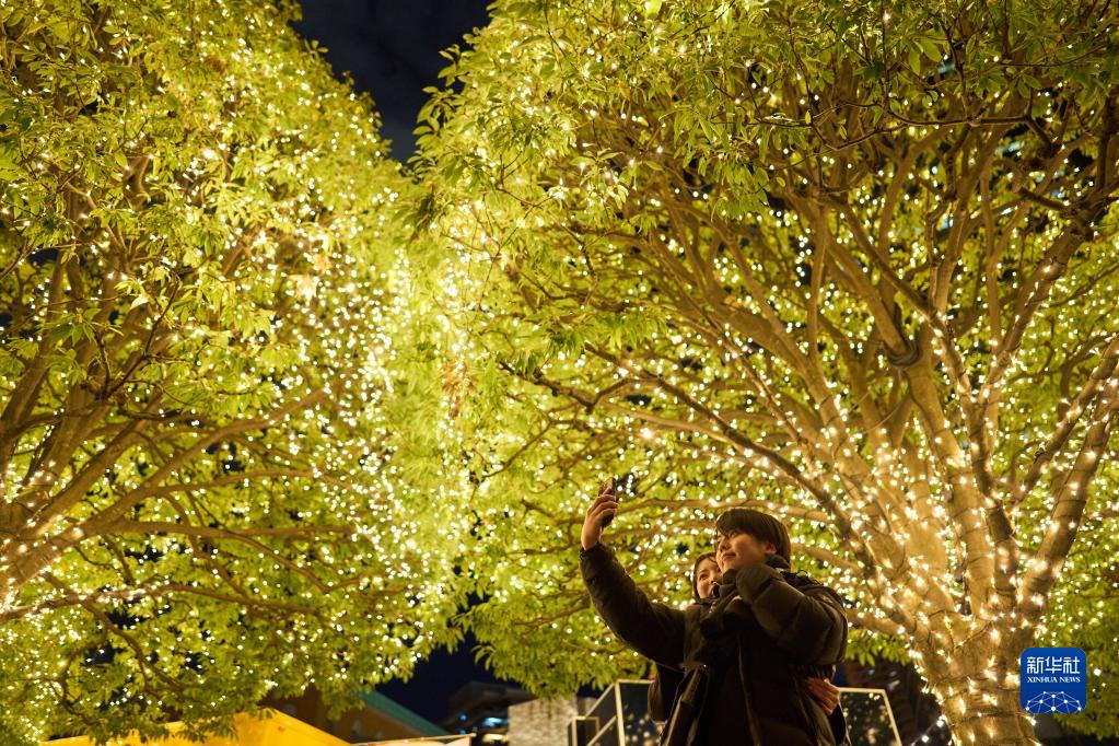 12月25日,游客在日本東京惠比壽花園點(diǎn)亮燈光的樹(shù)下合影留念。年末將近,東京多地點(diǎn)亮燈光辭舊迎新。新華社記者 張笑宇 攝