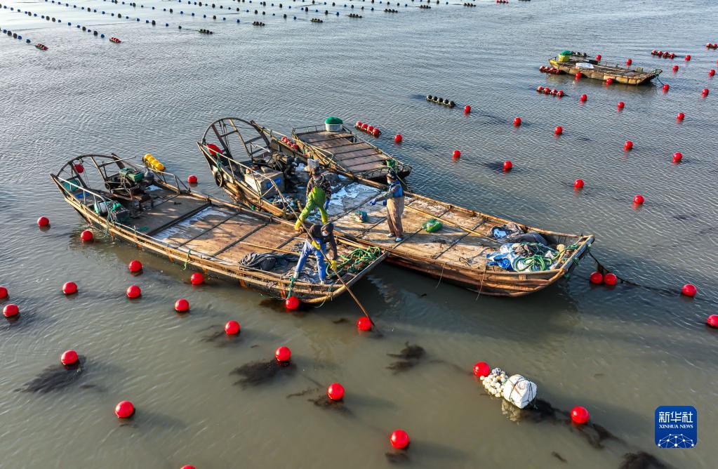 12月27日,在榮成市俚島灣海洋牧場(chǎng)海上養殖區,漁民駕駛漁船出海作業(yè)(無(wú)人機照片)。