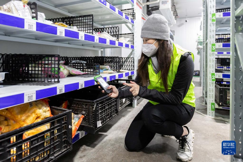 12月27日,在上海市徐匯區的美團買(mǎi)菜前置倉,青年突擊隊隊員根據設備提示,找到對應的庫位,掃碼確認。