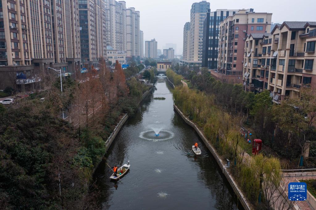 12月28日,龍泉街道的保潔人員在市陌河上清理漂浮物(無(wú)人機照片)。