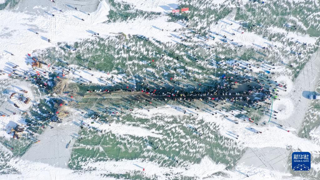 12月28日,游客在查干湖冰面上觀(guān)看冬捕(無(wú)人機照片)。