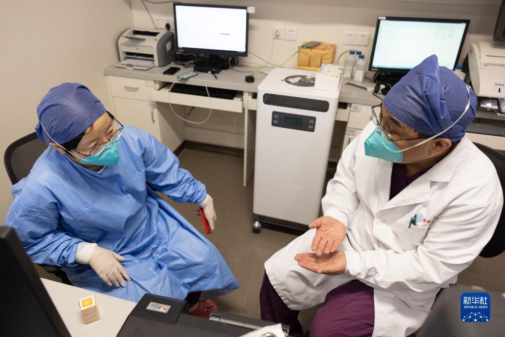 12月27日,在上海交通大學(xué)醫學(xué)院附屬新華醫院兒童急診ICU陽(yáng)性病區,新華醫院兒急危重癥醫學(xué)科主任朱曉東(右)和主治醫生朱月鈕在商量工作。