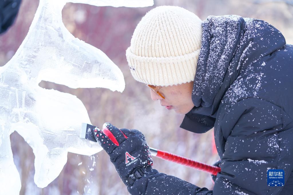 12月30日,在哈爾濱市兆麟公園,參賽選手在進(jìn)行冰雕創(chuàng )作。