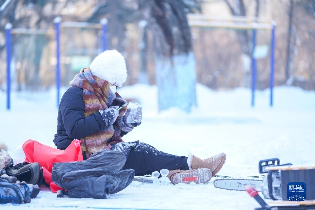 當日,在黑龍江省哈爾濱市,參加第17屆全國大學(xué)生冰雕藝術(shù)設計創(chuàng )作大賽的冰雕選手在嚴寒中進(jìn)行藝術(shù)創(chuàng )作。