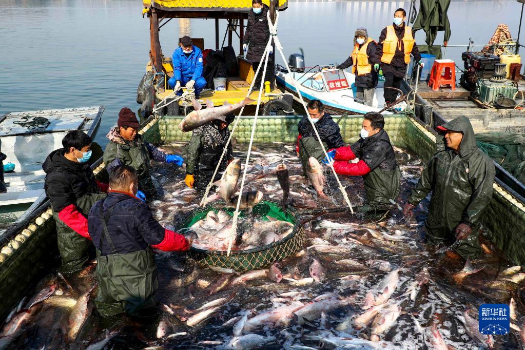 新年臨近,江蘇省泰州市姜堰區溱湖6000多畝水域進(jìn)入冬季捕魚(yú)季,漁民們抓緊捕撈供應節日市場(chǎng)。