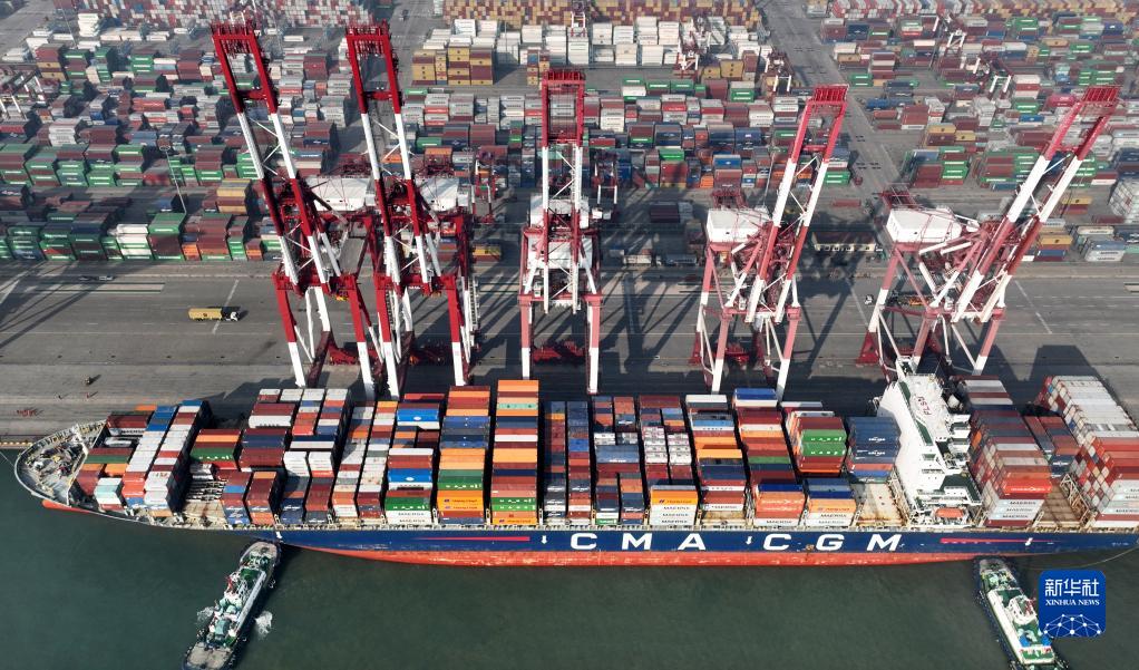 1月1日,一艘貨輪靠泊在青島港前灣QQCT集裝箱碼頭準備裝卸集裝箱(無(wú)人機照片)。