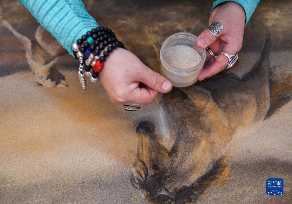 1月4日,阿拉騰畢力格在工作室內創(chuàng )作沙畫(huà)。