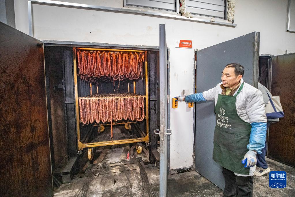 1月4日,在重慶市城口縣坪壩鎮新華村重慶美綴美食品有限公司,工人在智能化炕房車(chē)間利用升降機將需要熏制的香腸放進(jìn)炕房。