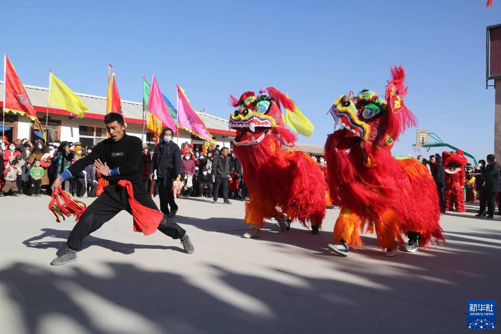 新春佳節臨近,甘肅省定西市的一些社火隊組織排練舞龍、舞獅、劃旱船等傳統社火節目,迎接新春佳節的到來(lái)。