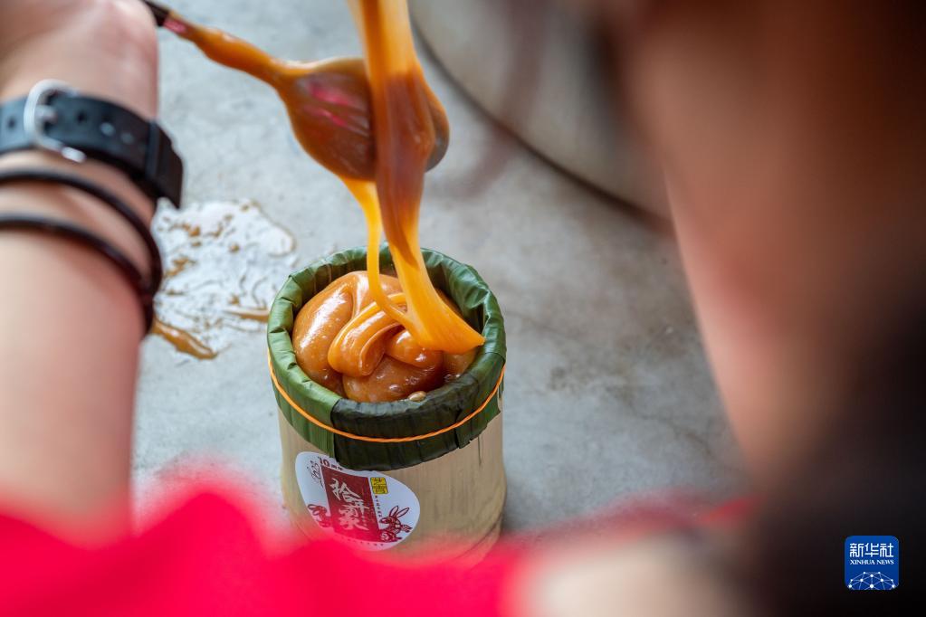 1月8日,在馬來(lái)西亞首都吉隆坡以北約70公里的新古毛,工作人員把蒸好的年糕盛到竹筒里。