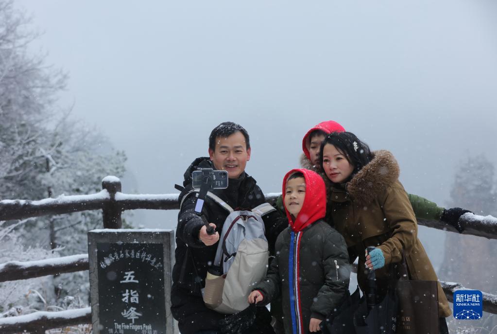 1月15日,游客在張家界國家森林公園黃石寨賞雪游玩。
