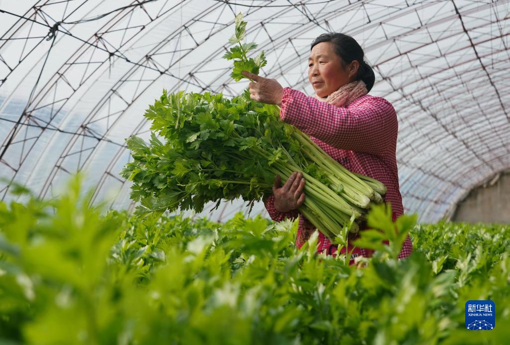 1月19日,唐山市豐潤區任各莊鎮的農民在大棚內采收芹菜。