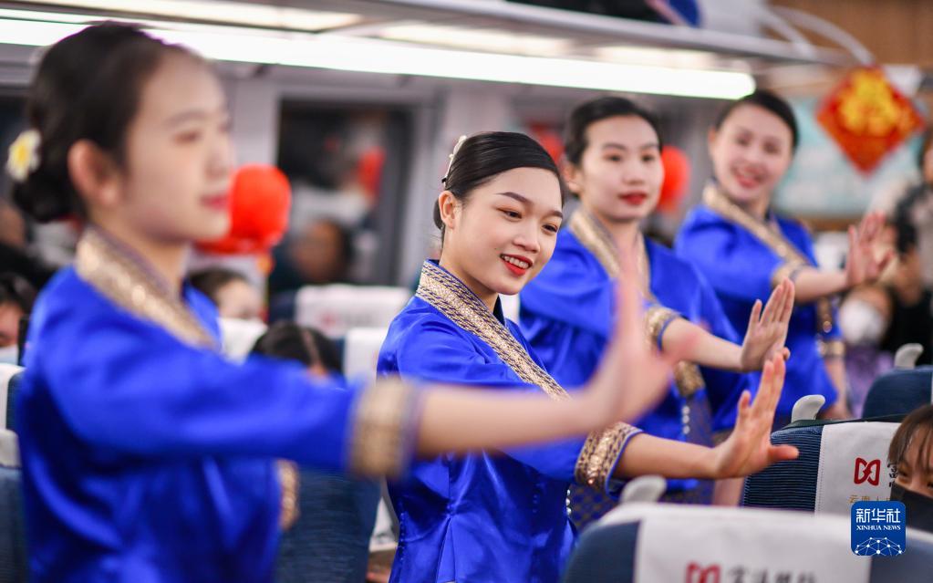 當日,奔馳在中老鐵路上的C272次列車(chē)車(chē)廂內,一場(chǎng)以“中老一家親,祥和中國年”為主題的列車(chē)春晚精彩上演。