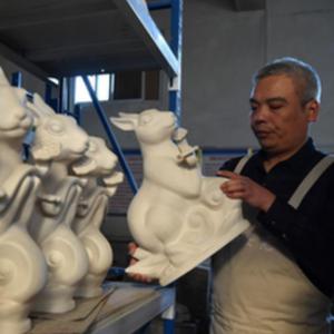 1月18日,在寶豐縣大營(yíng)鎮,汝瓷藝人王占穩在修飾汝瓷生肖兔素胎。