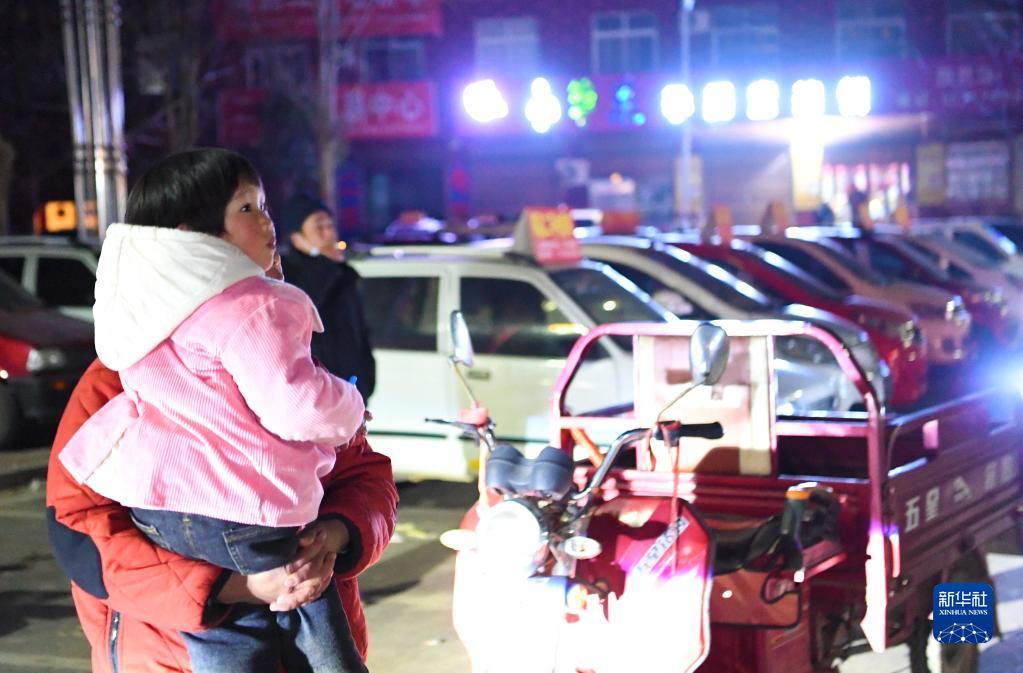 1月18日晚,女兒靳佳穎和爺爺奶奶來(lái)到村廣場(chǎng),等候父母返鄉乘坐的長(cháng)途大巴。