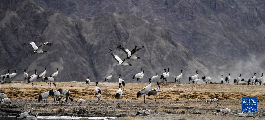 在西藏雅魯藏布江中游河谷黑頸鶴國家級自然保護區日喀則片區拉孜縣附近,大量越冬的黑頸鶴翩翩起舞,迎接春天的到來(lái)。