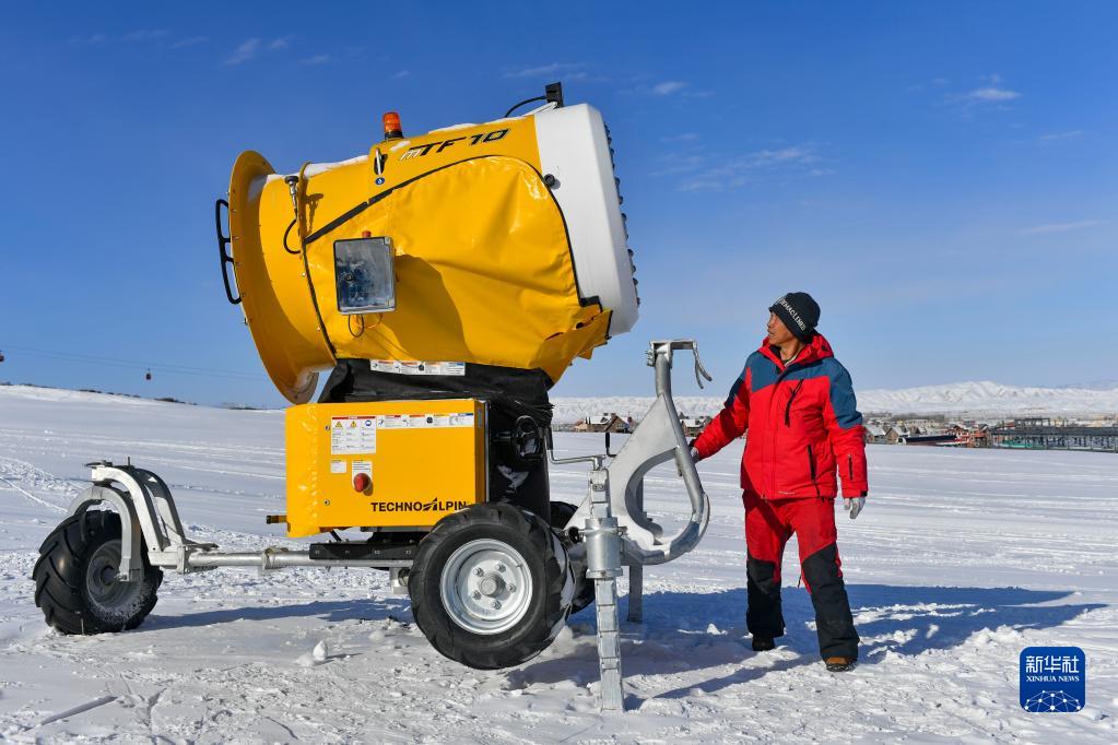 新疆絲綢之路國際度假區工作人員黃文勇在雪場(chǎng)工作(1月25日攝)。他和數十名工友為度假區的幾十臺造雪機提供運維保障。