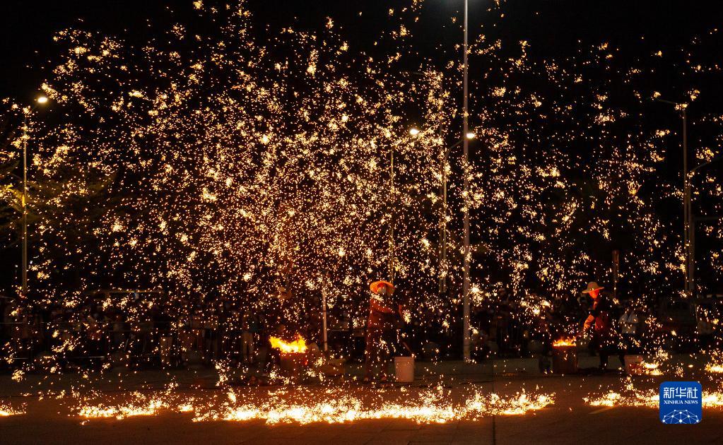 當晚,廣東省揭陽(yáng)市上演了一場(chǎng)精彩的“打鐵花”非遺表演活動(dòng),吸引了大量市民和游客前來(lái)觀(guān)賞,營(yíng)造出濃郁的節日氛圍。