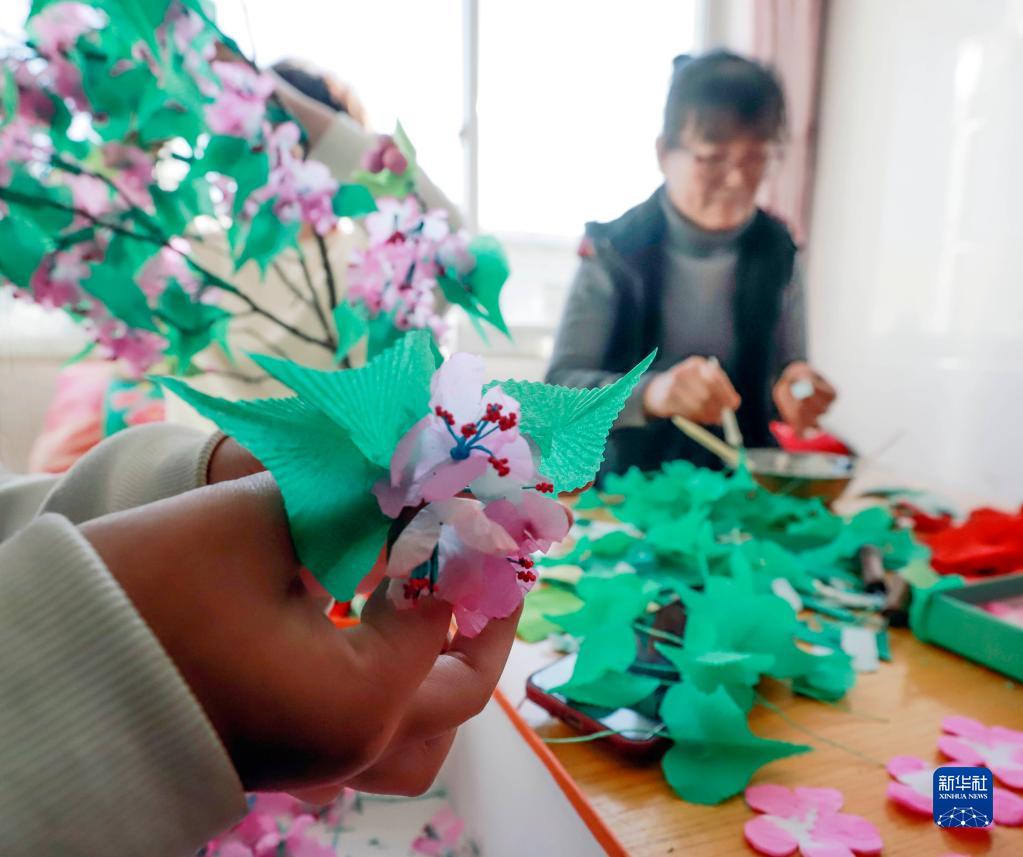 1月28日,遷西縣灑河橋鎮的民間藝人在趕制元宵節演出的跑花燈。