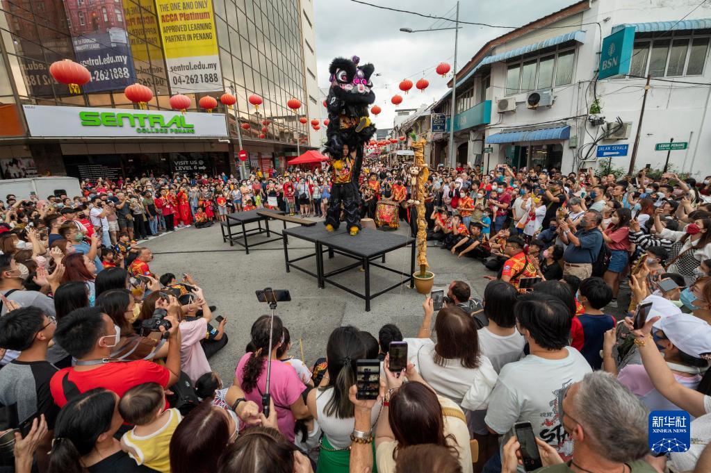 這是1月28日在馬來(lái)西亞檳城州首府喬治市舉行的檳城廟會(huì )上拍攝的舞獅表演。
