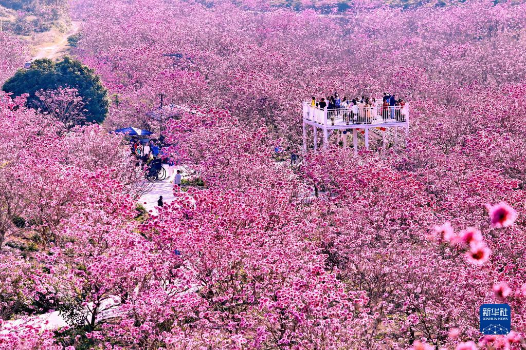 1月29日,游客在江門(mén)市新會(huì )區大澤鎮山頭坪游玩賞花。