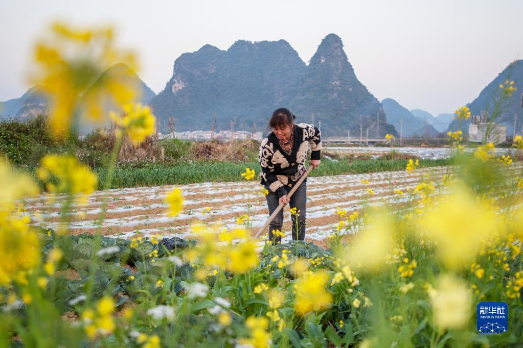 1月29日,在廣西靖西市新靖鎮亮表村,農民在田間管護蔬菜。