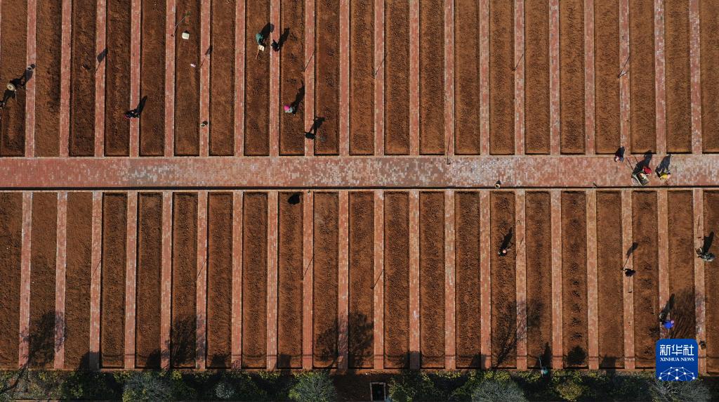 1月30日,在湖南省湘西土家族苗族自治州花垣縣農業(yè)園里,農民忙著(zhù)平整土地(無(wú)人機照片)。
