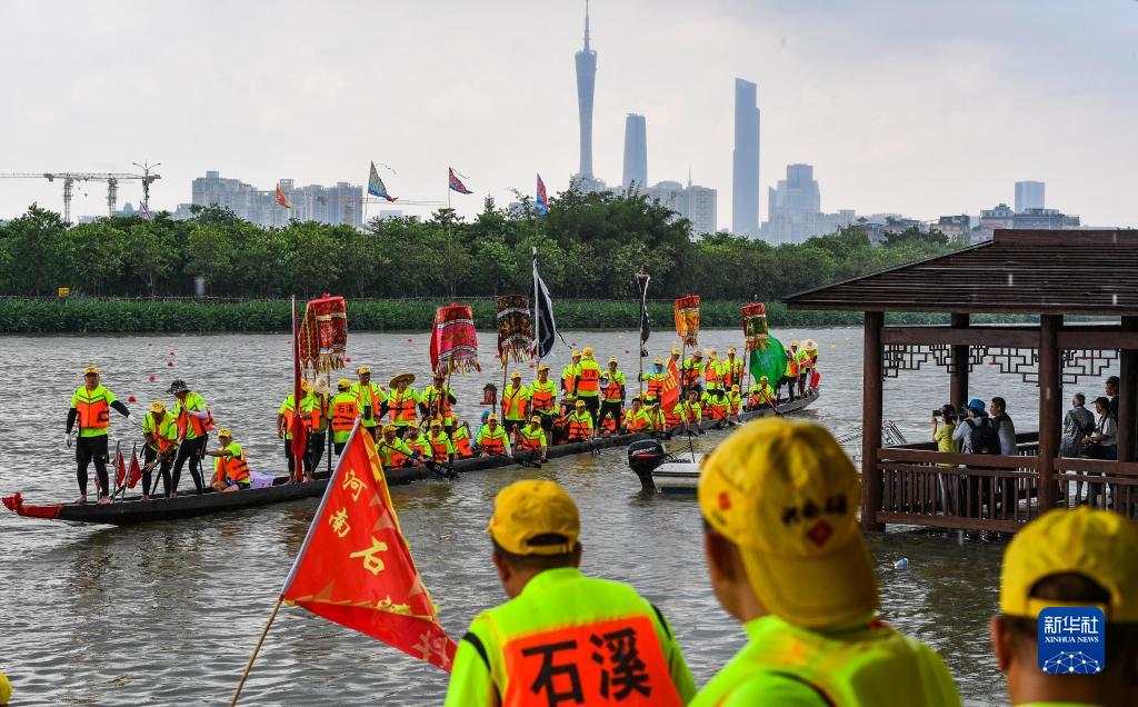 2019年端午節期間,附近村民在修復后的廣州海珠濕地水系劃龍舟(2019年6月6日攝)。
