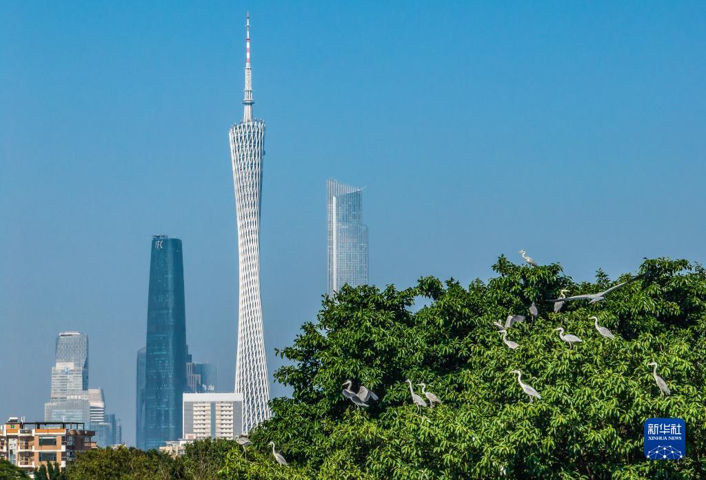 廣州海珠濕地海珠湖鳥(niǎo)島上的蒼鷺與背后的城市景觀(guān)相得益彰(2023年1月7日攝)。