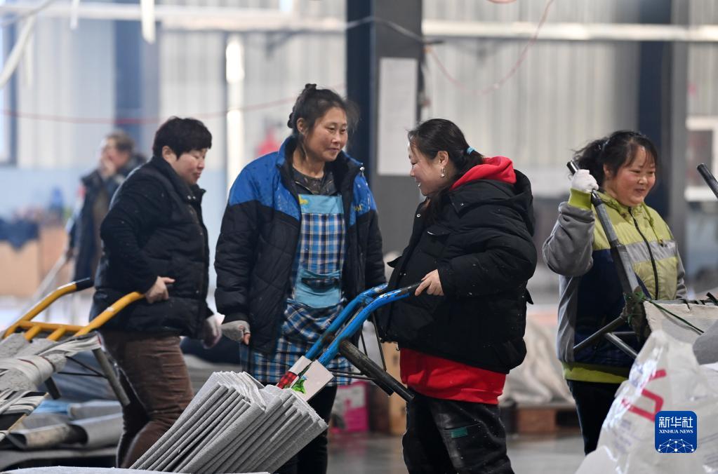 在天津市武清區崔黃口鎮凱利地毯有限公司,工人搬運地毯(2月1日攝)。