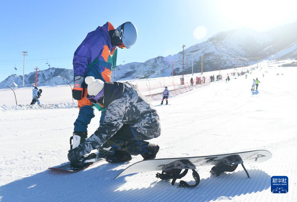 在新疆白云國際滑雪場(chǎng),把爾斯·木拉提(右)教學(xué)員單板滑雪技巧(1月26日攝)。